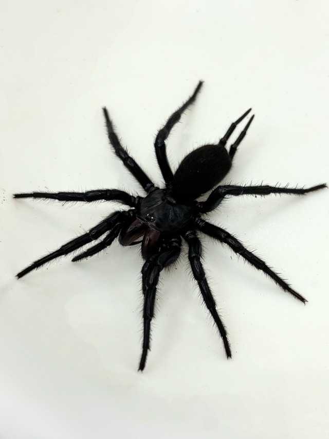 八重山諸島に生息するジョウゴグモ。大きさは最大で体長約4cm。 体長約2cmの画像の個体を発送させていただきます。 漆黒のボディに怪しく赤く染まる牙が恐ろしい雰囲気を醸し出す地中性のクモ。 日本のタランチュラと表現される本種ですが、見た目はまさにタランチュラ。 気象も荒くとても攻撃的な面を持っていますので、取り扱いには注意が必要です。
