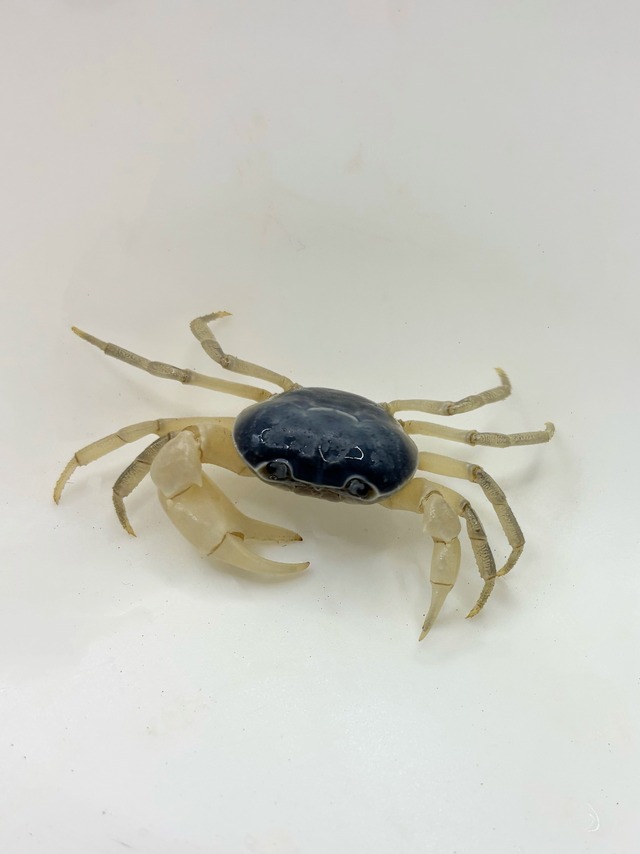 ベトナムに生息する陸棲のカニ。大きさは最大で甲幅約6cm。 甲幅約4cmのオスを発送させていただきます。 ブルーパイレーツとも呼ばれる青いカニ。 最大の特徴はその湾曲したハサミです。 陸棲ですが、脱皮の際はある程度の深さの水場が必要です。 餌はなんでも良く食べます!