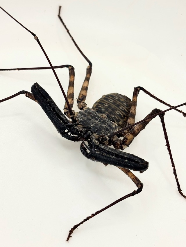 メキシコに生息するウデムシ。大きさは最大で体長約3cm。 体長約2cmの画像の個体を発送させていただきます。 ウデの長さが不気味でかっこいい昆虫です。 あまり活発には動きませんが、大変丈夫でウデムシの入門種です。