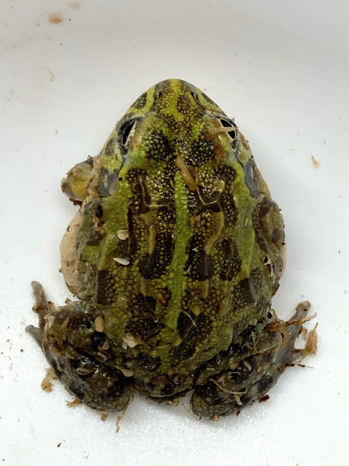 小さい時はトノサマガエルのようですが、大きくなるとオリーブグリーンの体になり、何気に色も美しいです。現地ではサバンナに生息しているので、湿った場所と乾いた場所を作ると調子良く飼育できます。