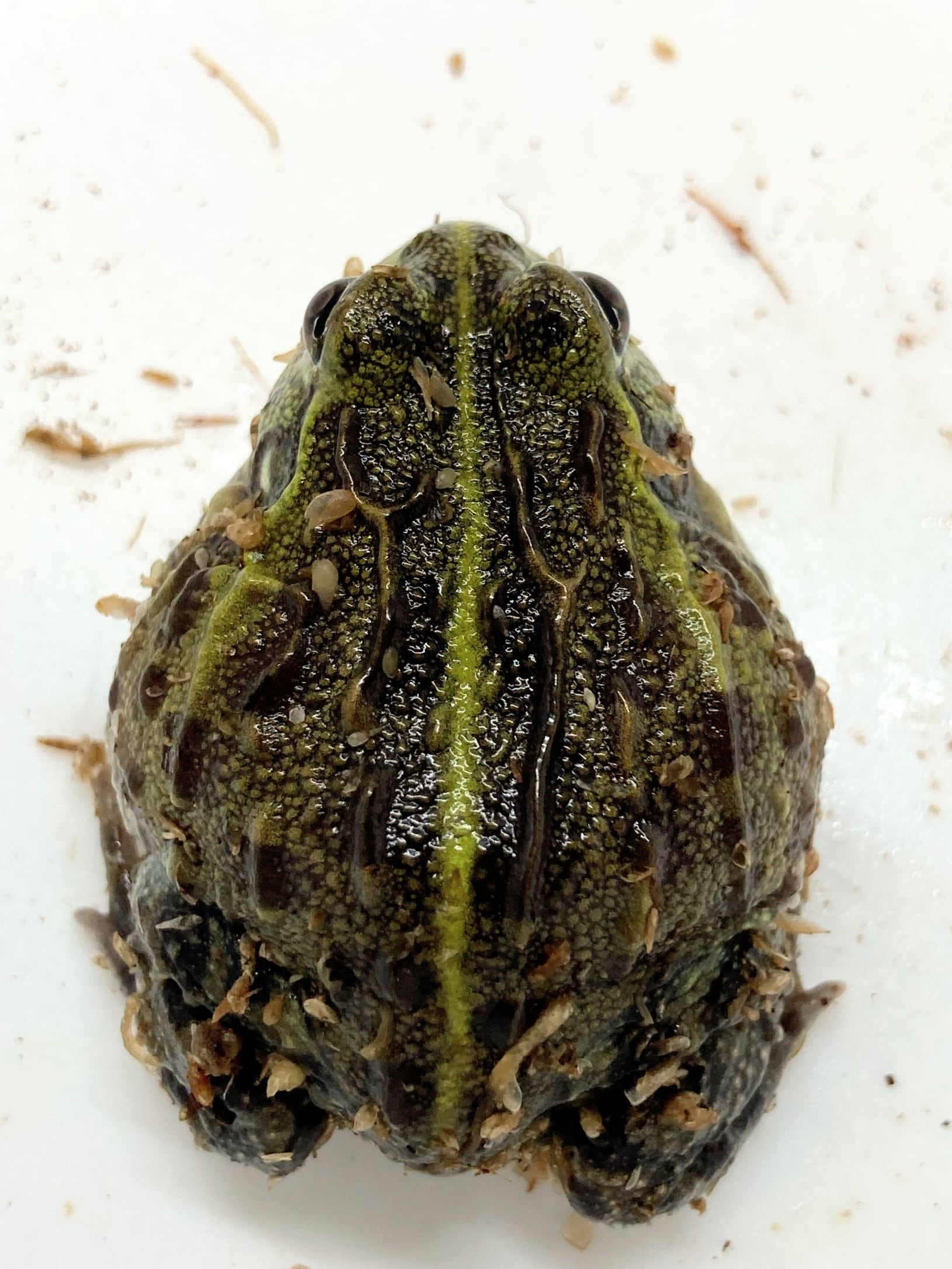 小さい時はトノサマガエルのようですが、大きくなるとオリーブグリーンの体になり、何気に色も美しいです。現地ではサバンナに生息しているので、湿った場所と乾いた場所を作ると調子良く飼育できます。