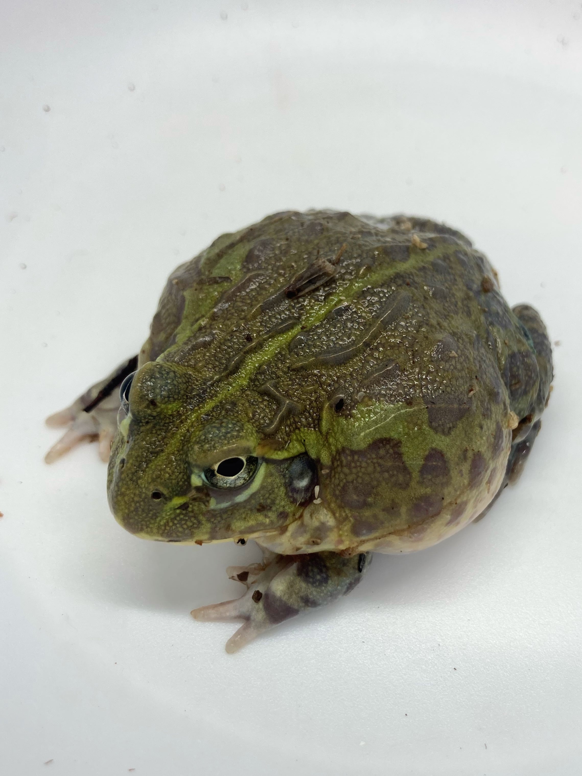 小さい時はトノサマガエルのようですが、大きくなるとオリーブグリーンの体になり、何気に色も美しいです。現地ではサバンナに生息しているので、湿った場所と乾いた場所を作ると調子良く飼育できます。
