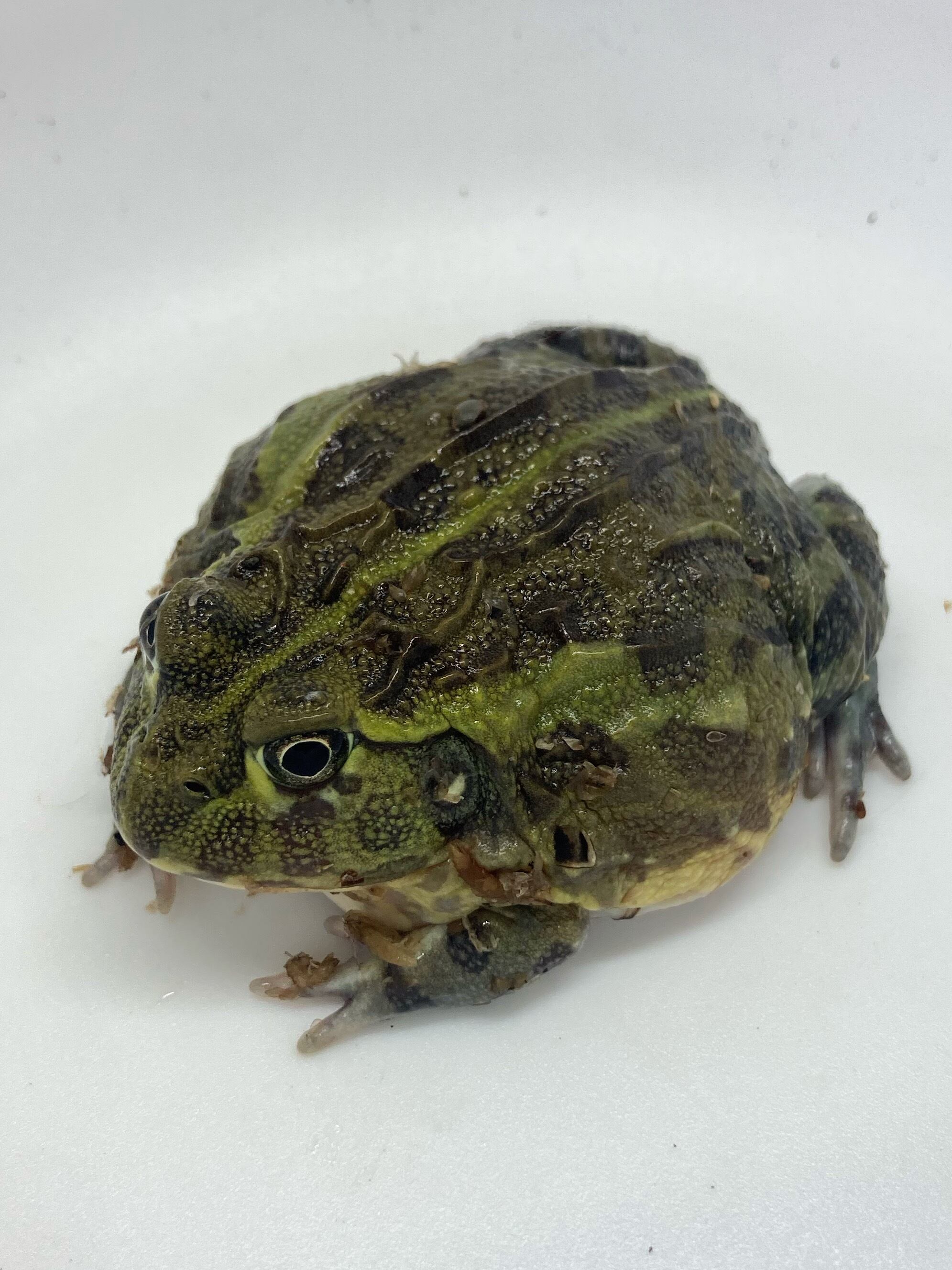 小さい時はトノサマガエルのようですが、大きくなるとオリーブグリーンの体になり、何気に色も美しいです。現地ではサバンナに生息しているので、湿った場所と乾いた場所を作ると調子良く飼育できます。