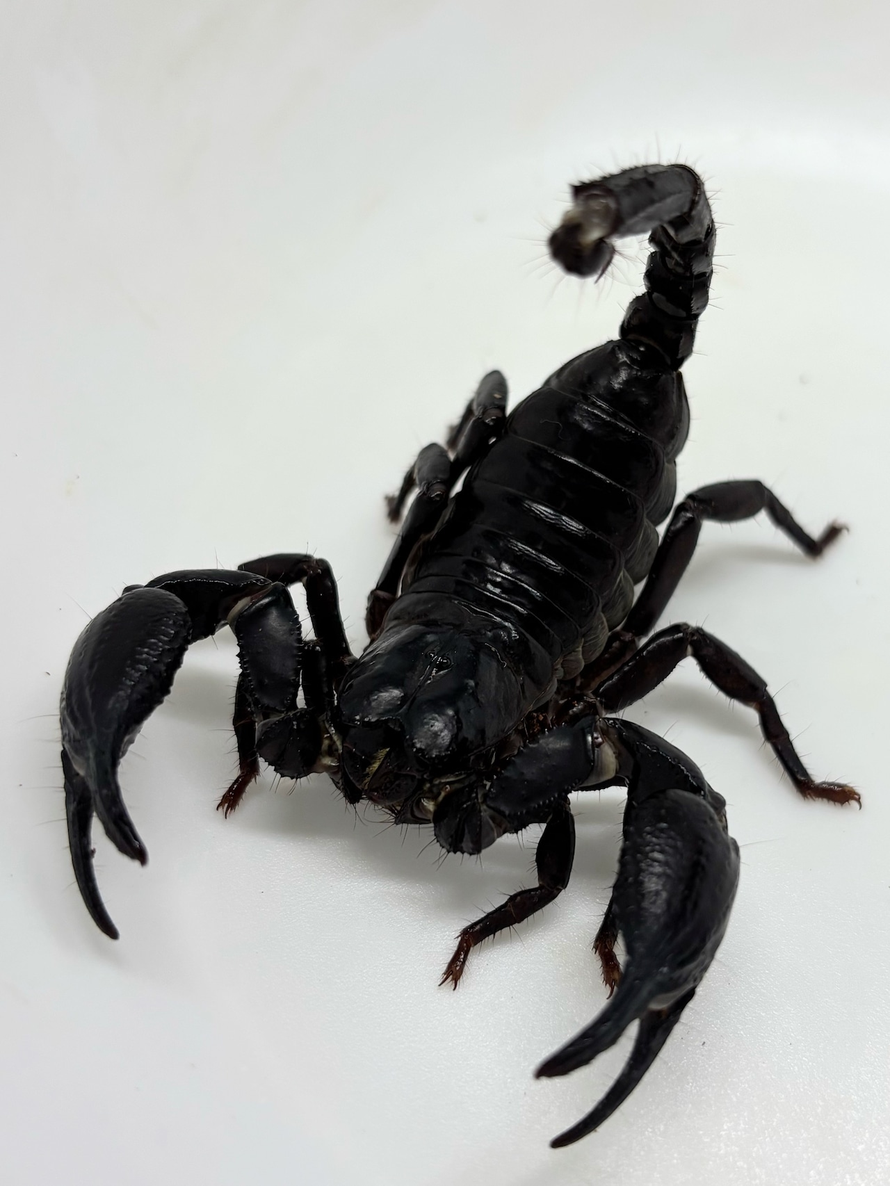 アジアンフォレストスコーピオンとして総称されるサソリの1種。大きさは最大で全長約15cm。