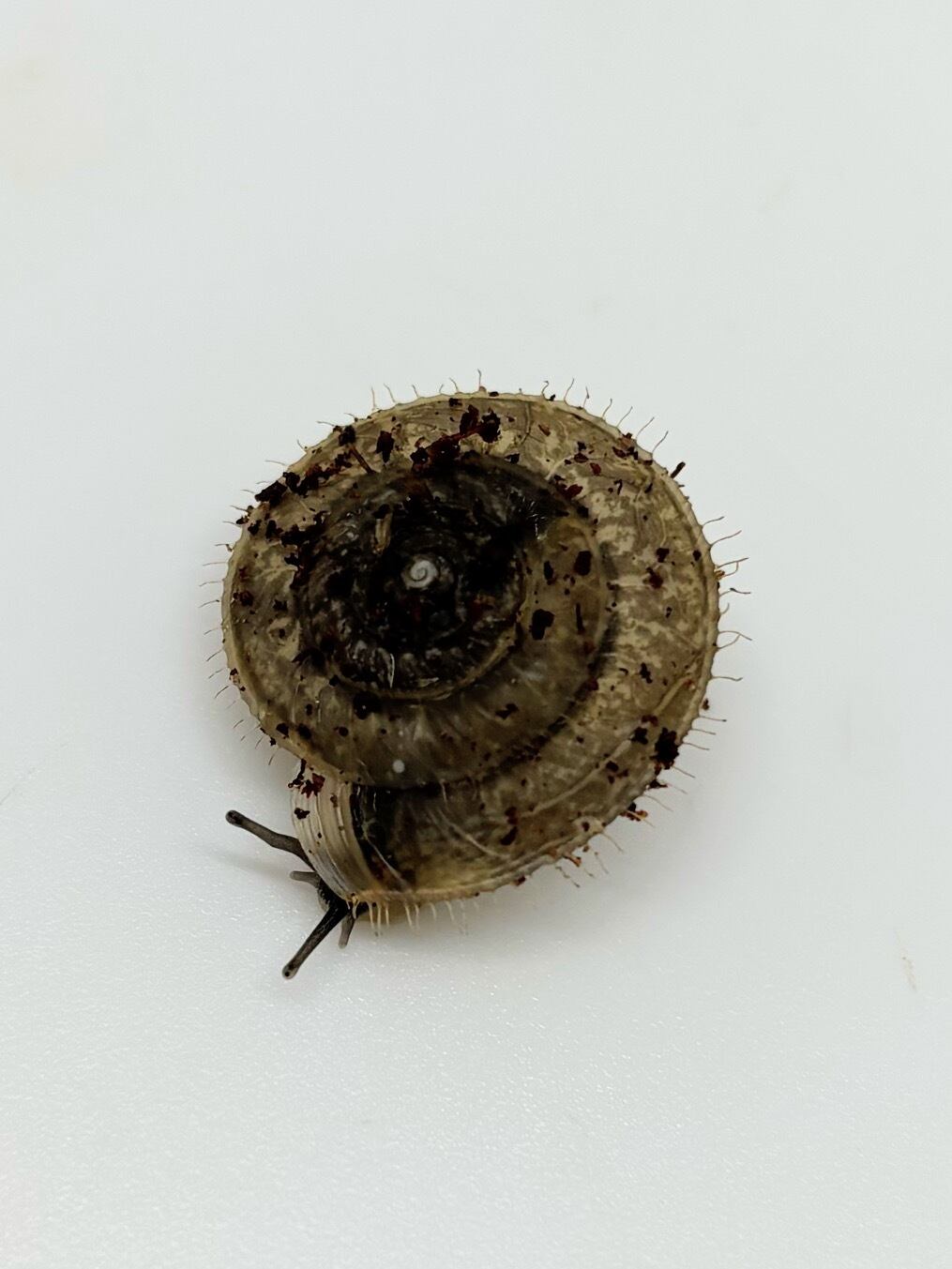ベッコウ柄の甲羅に殻を縁取る毛が特徴的なカタツムリ。
