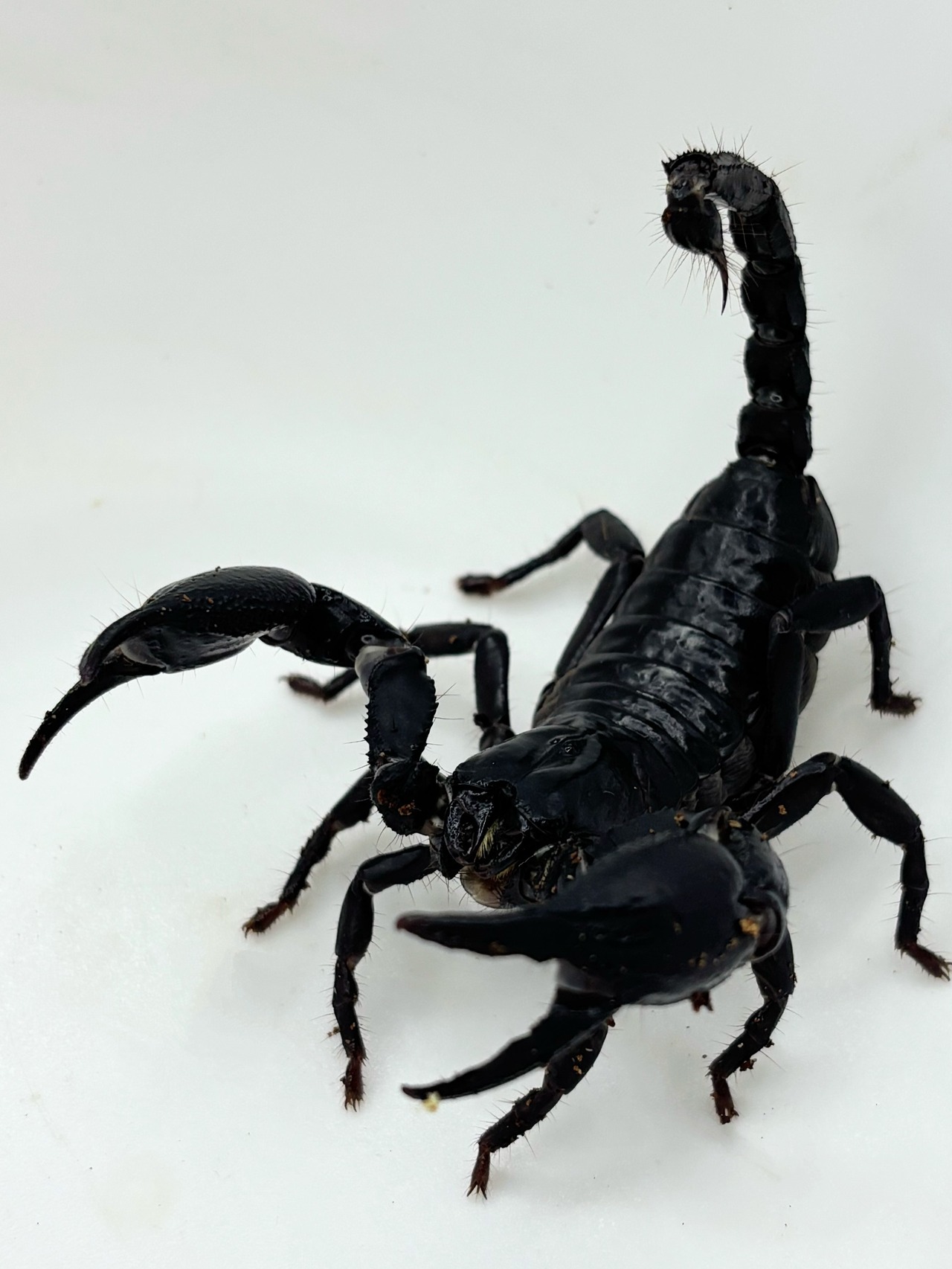 大きなハサミとやや茶色みがかったボディが特徴の大型のサソリです。