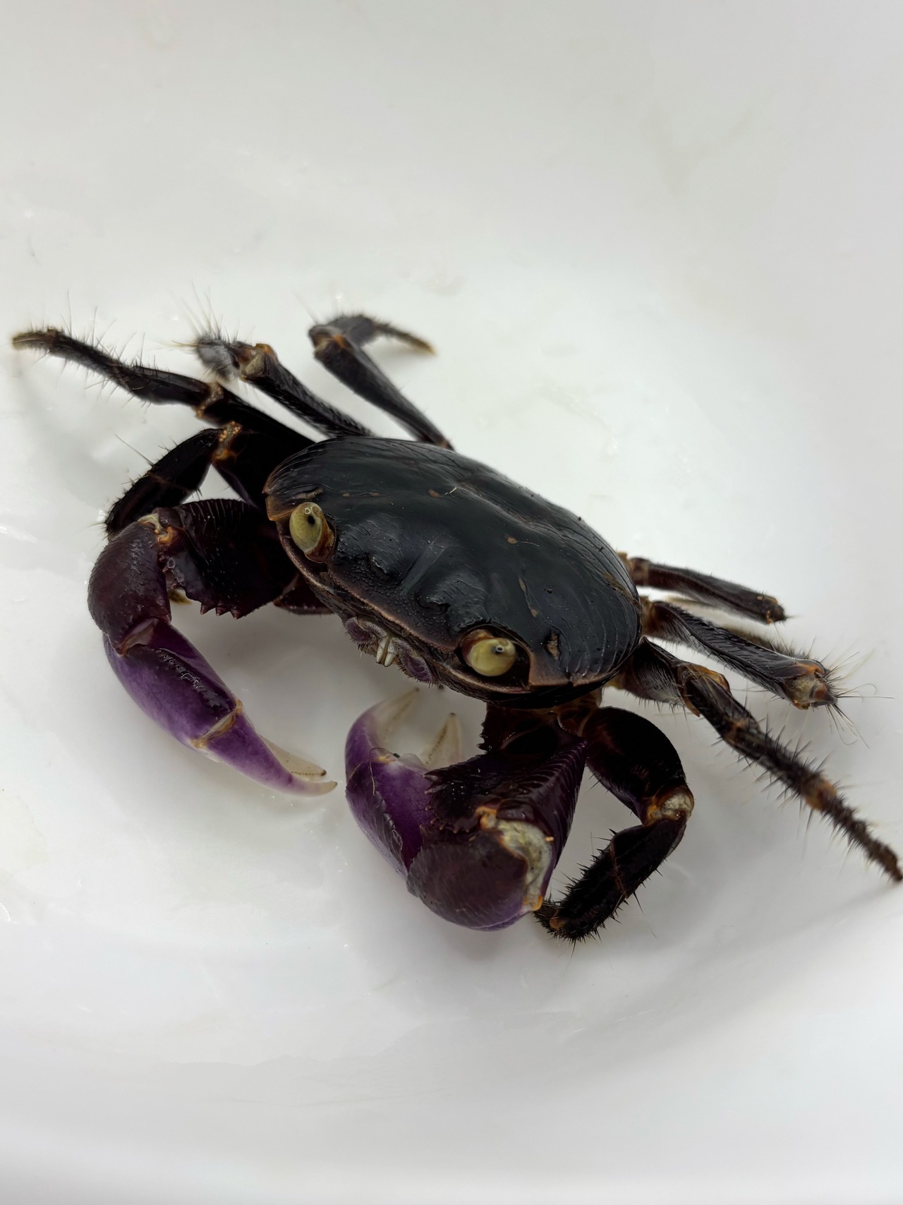 伊豆諸島や四国以南の暖かい地域に生息する陸生のカニ。大きさは最大で甲幅約4cm。