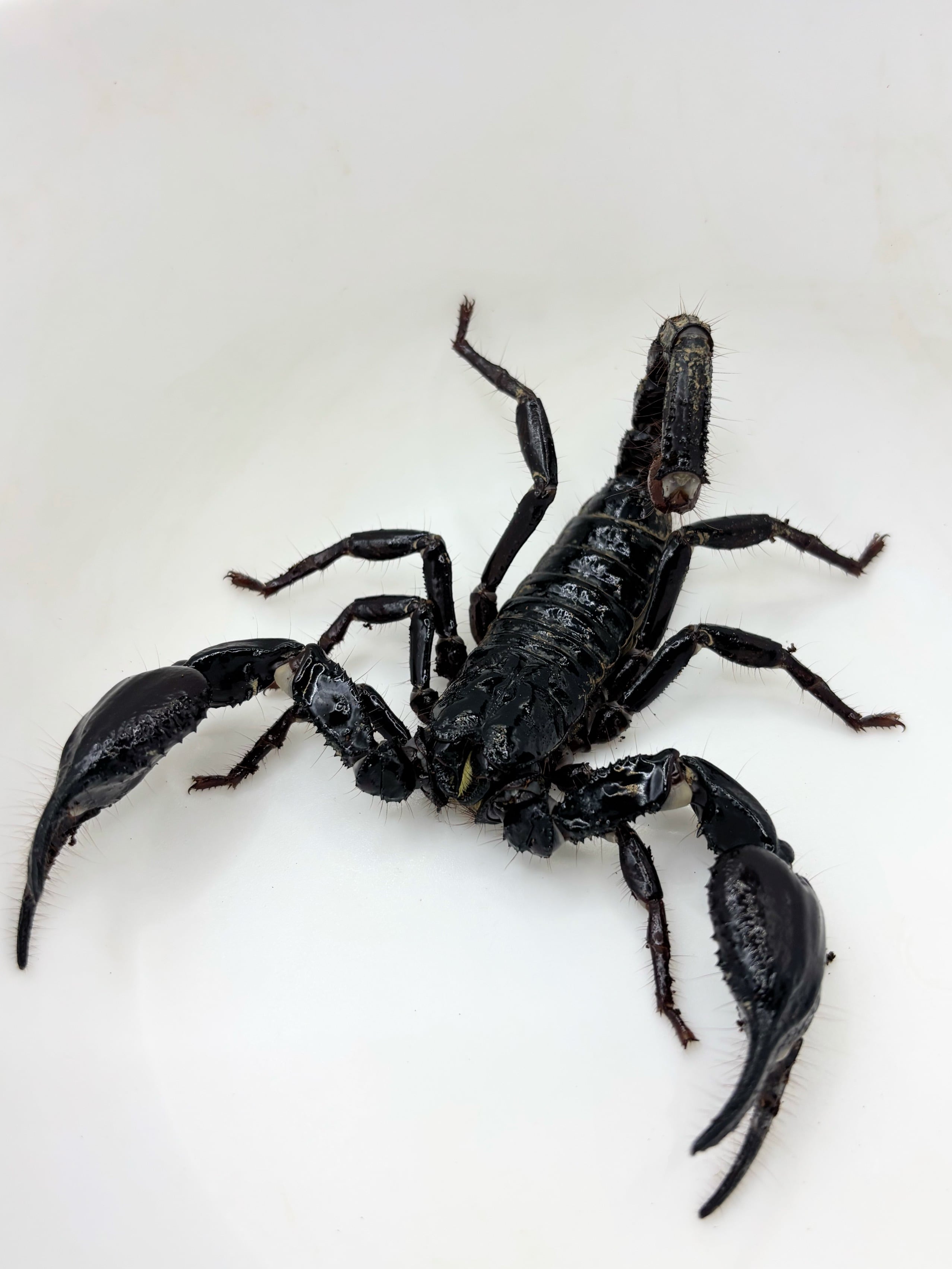 一般的なアジアンフォレストスコーピオンの中でハサミが長く、角張っているのが特徴です。