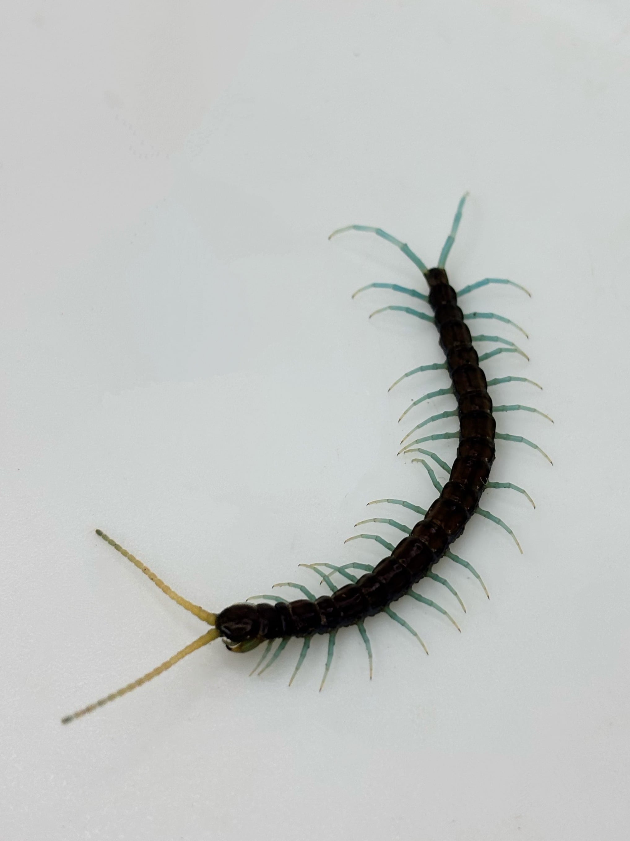 薄く赤みがかったボディに最大の特徴である淡いグリーンの脚が特徴の美ムカデ!