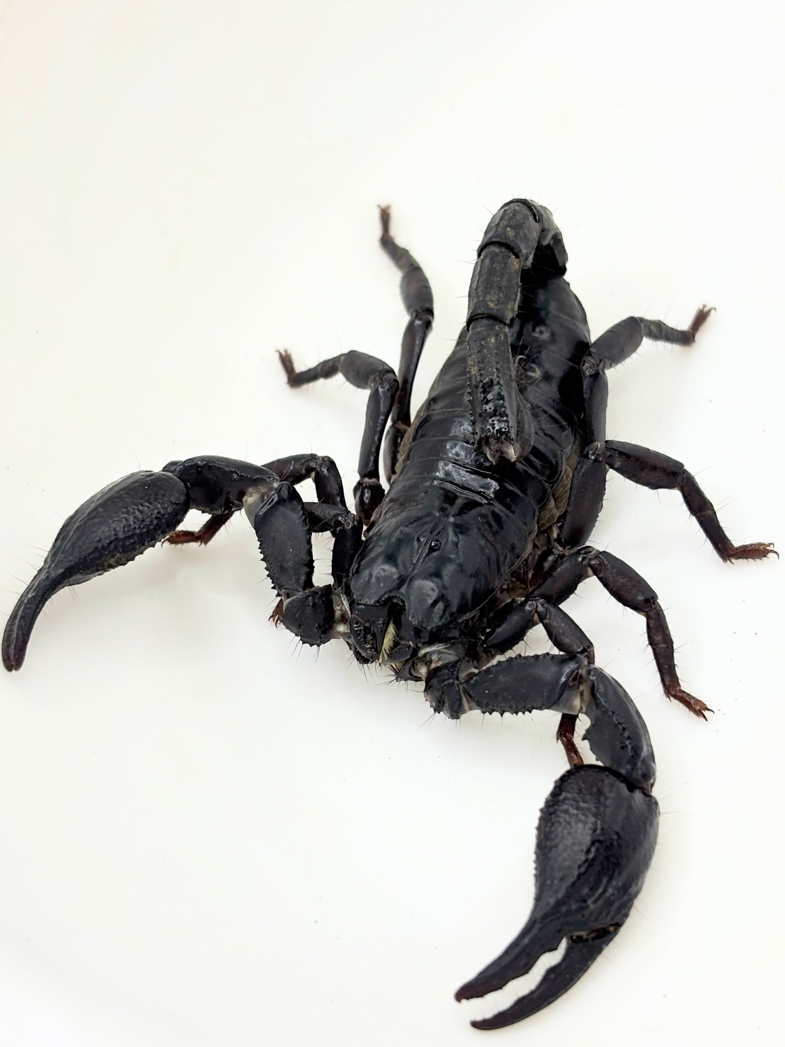 大きなハサミとやや茶色みがかったボディが特徴の大型のサソリです。