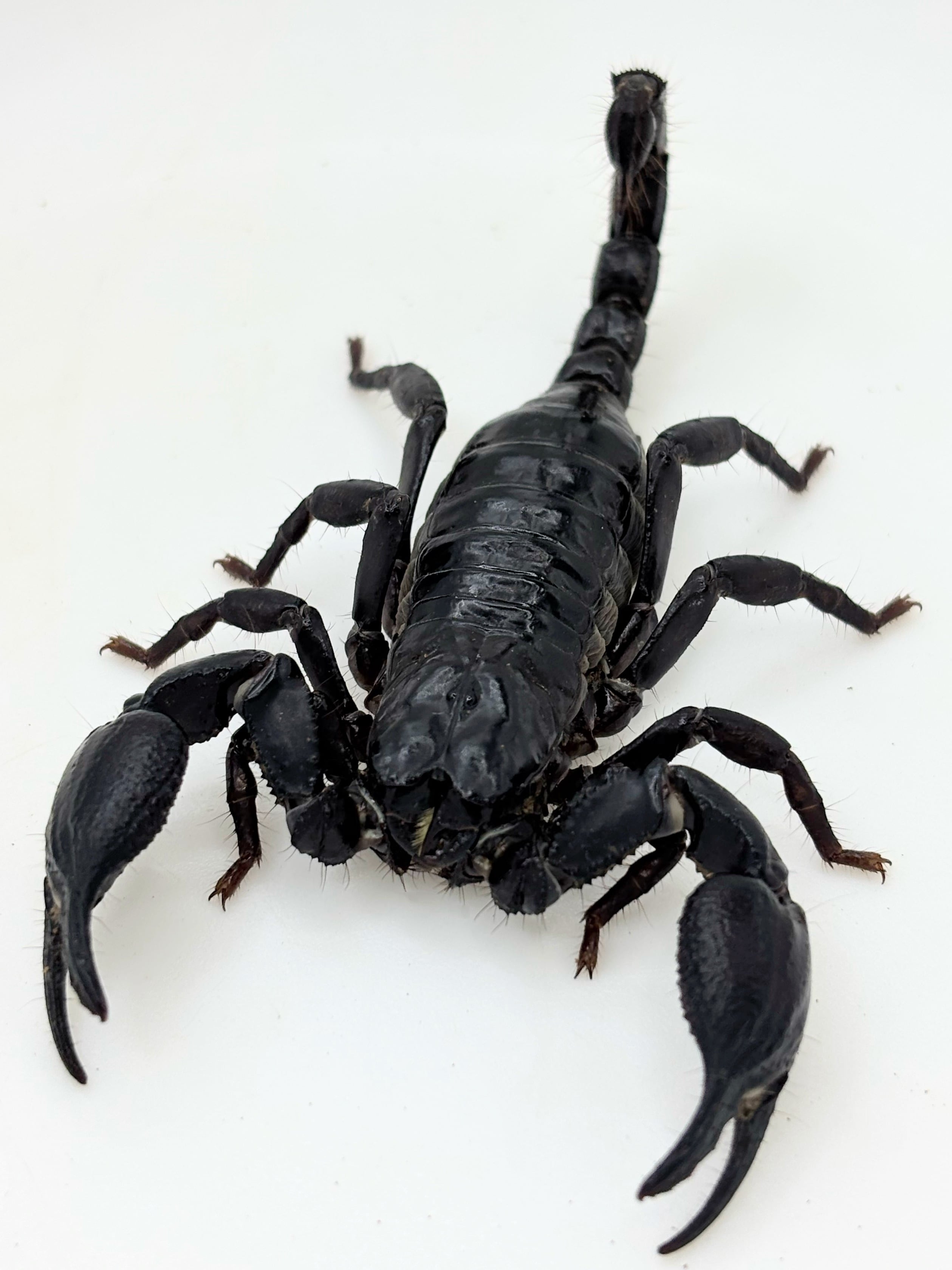 アジアンフォレストスコーピオンとして総称されるサソリの1種。大きさは最大で全長約15cm。