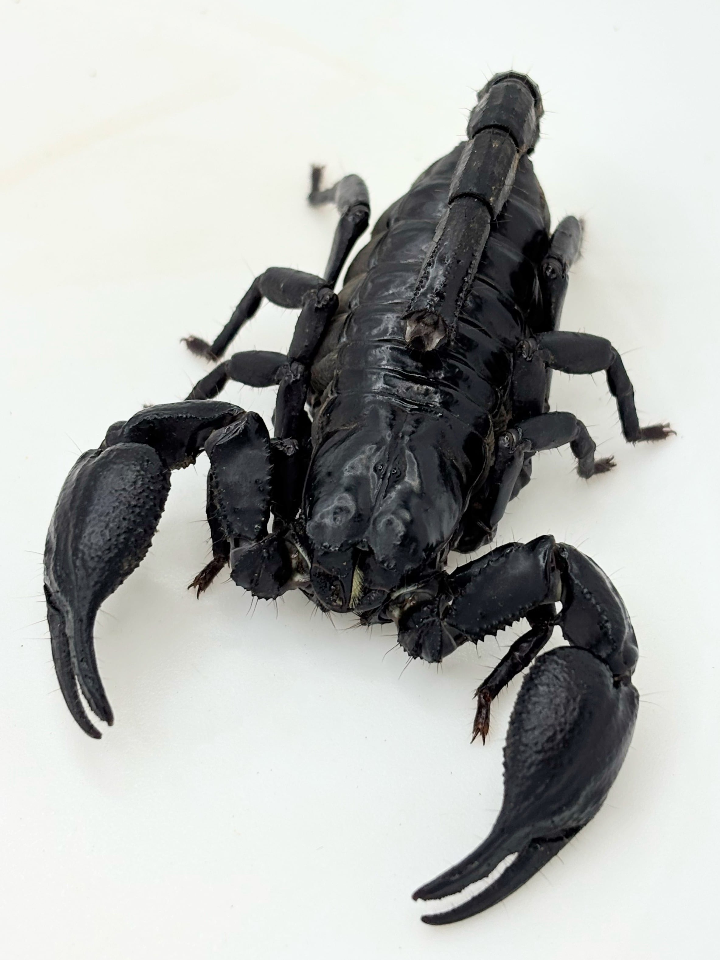 大きなハサミとやや茶色みがかったボディが特徴の大型のサソリです。