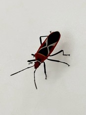 赤い体と黒い羽、大きく白い十字が強烈なインパクトを持つカメムシ。