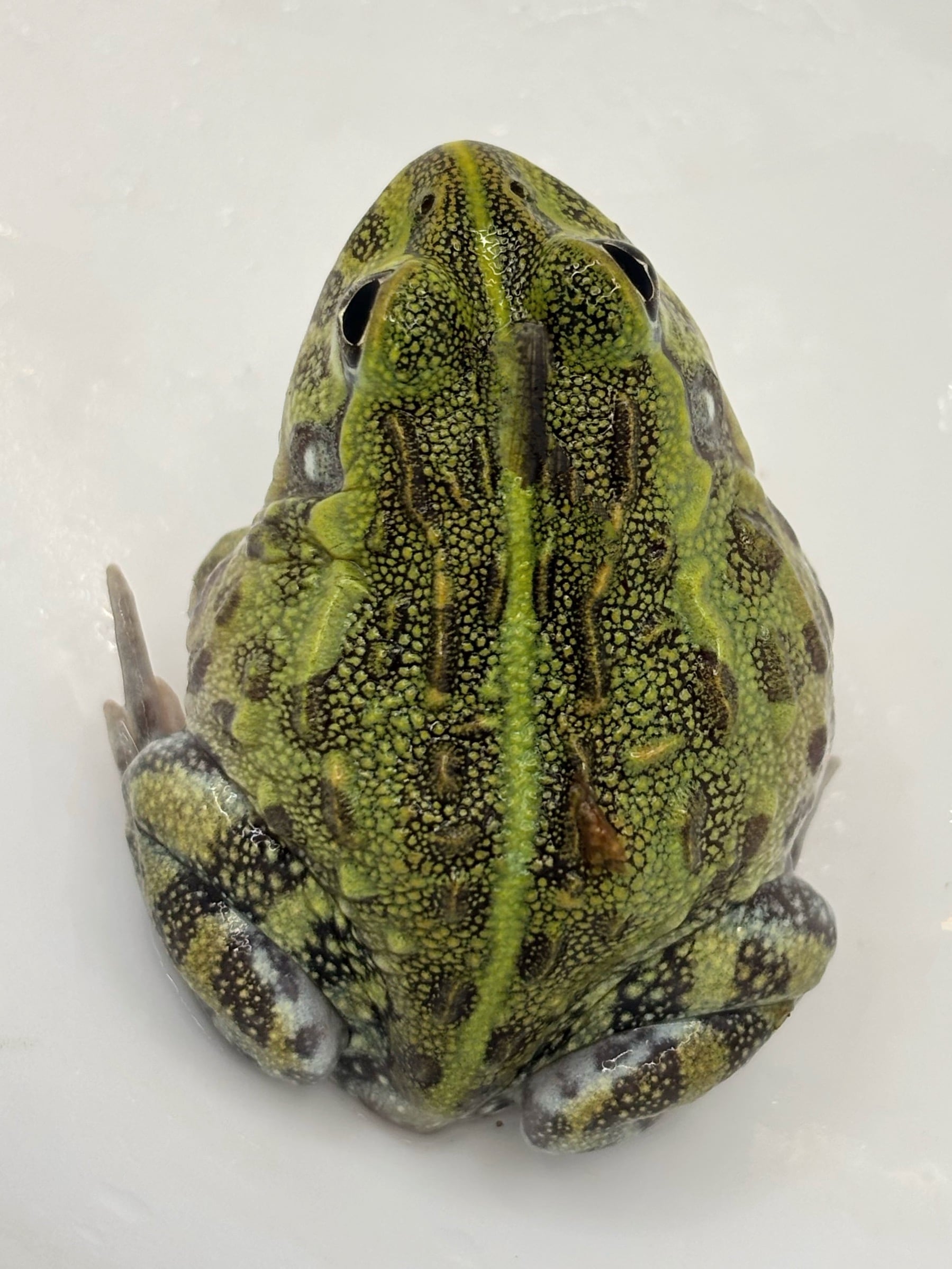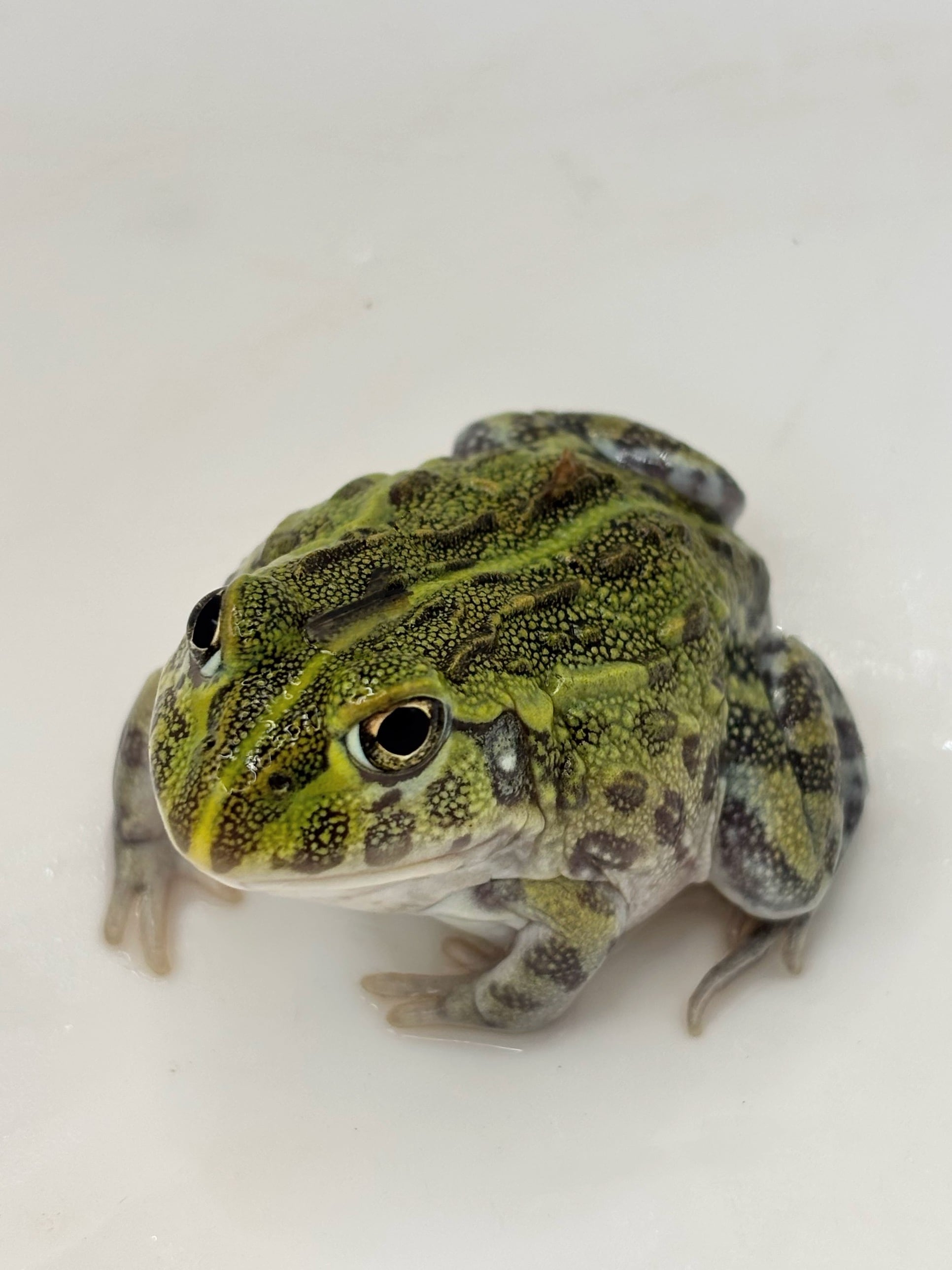 小さい時はトノサマガエルのようですが、大きくなるとオリーブグリーンの体になり、何気に色も美しいです。現地ではサバンナに生息しているので、湿った場所と乾いた場所を作ると調子良く飼育できます。