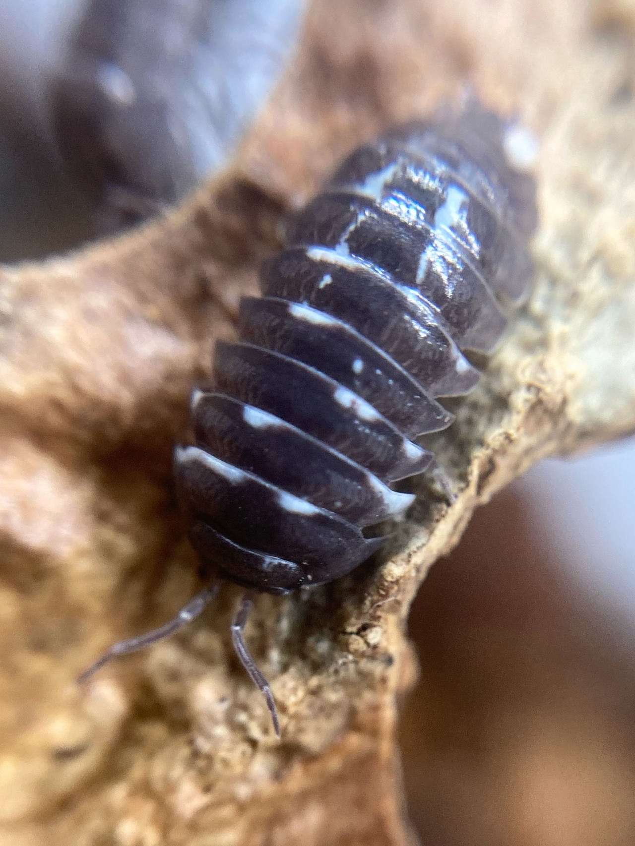 黒いボディに白いスポット模様が美しいダンゴムシ。大きさは普通のダンゴムシくらい。