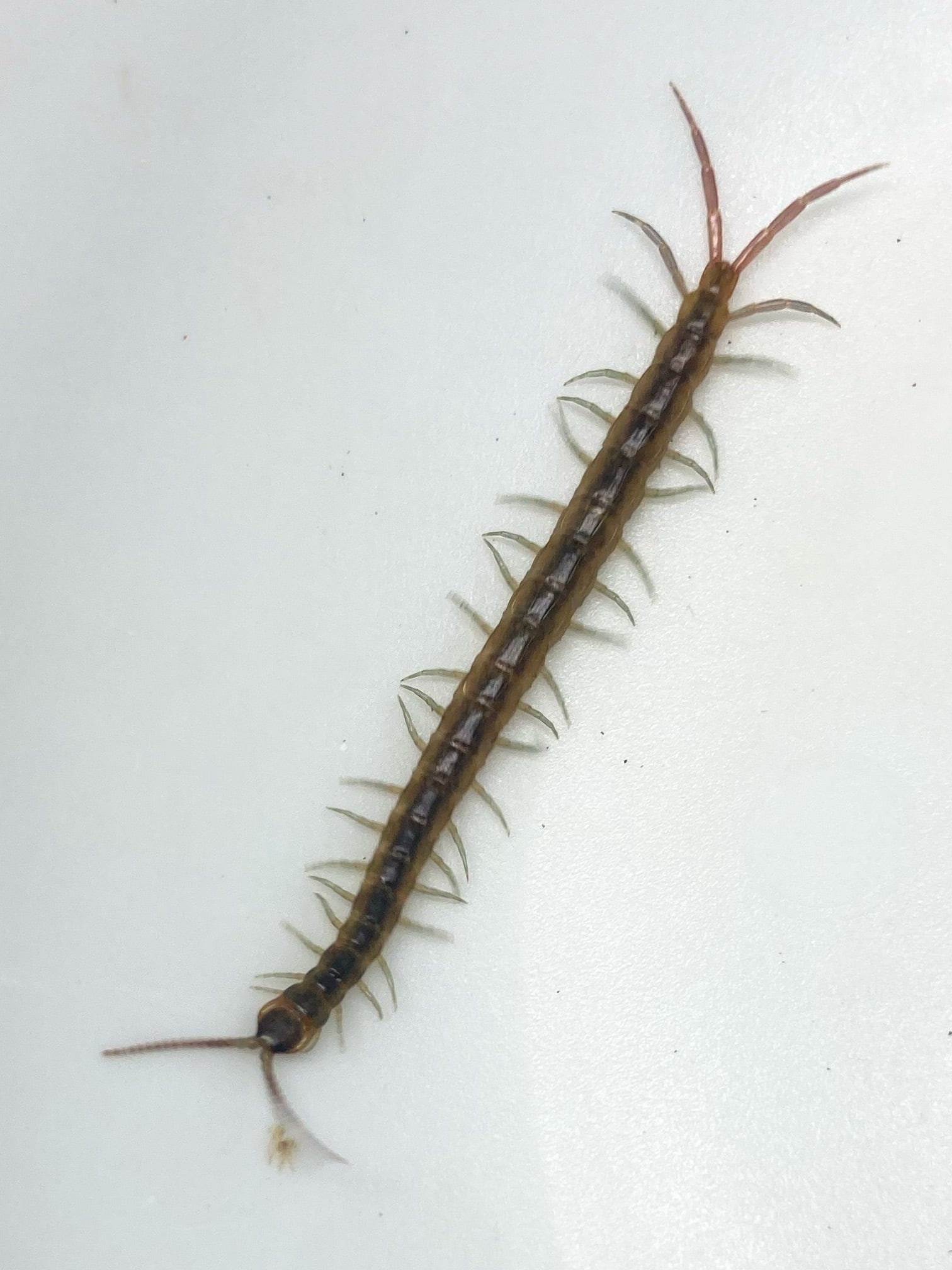 体側が透けたようなカラーリングで、黒の太いストライプが入り、なんたも美しいガラス細工のようなムカデです。