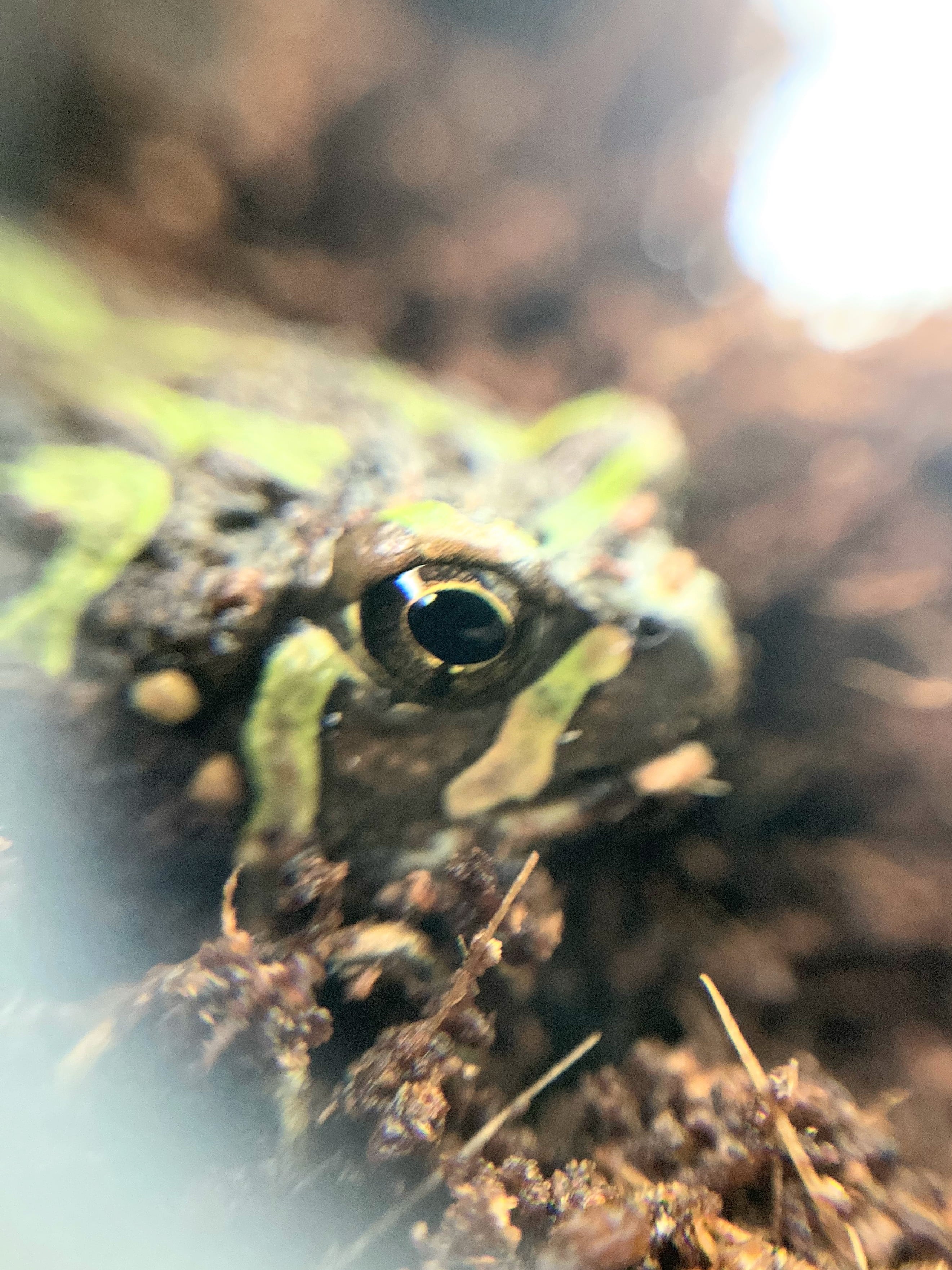 ベルツノガエルのような体色で、鮮やかな緑と網目模様が美しいカエルです。