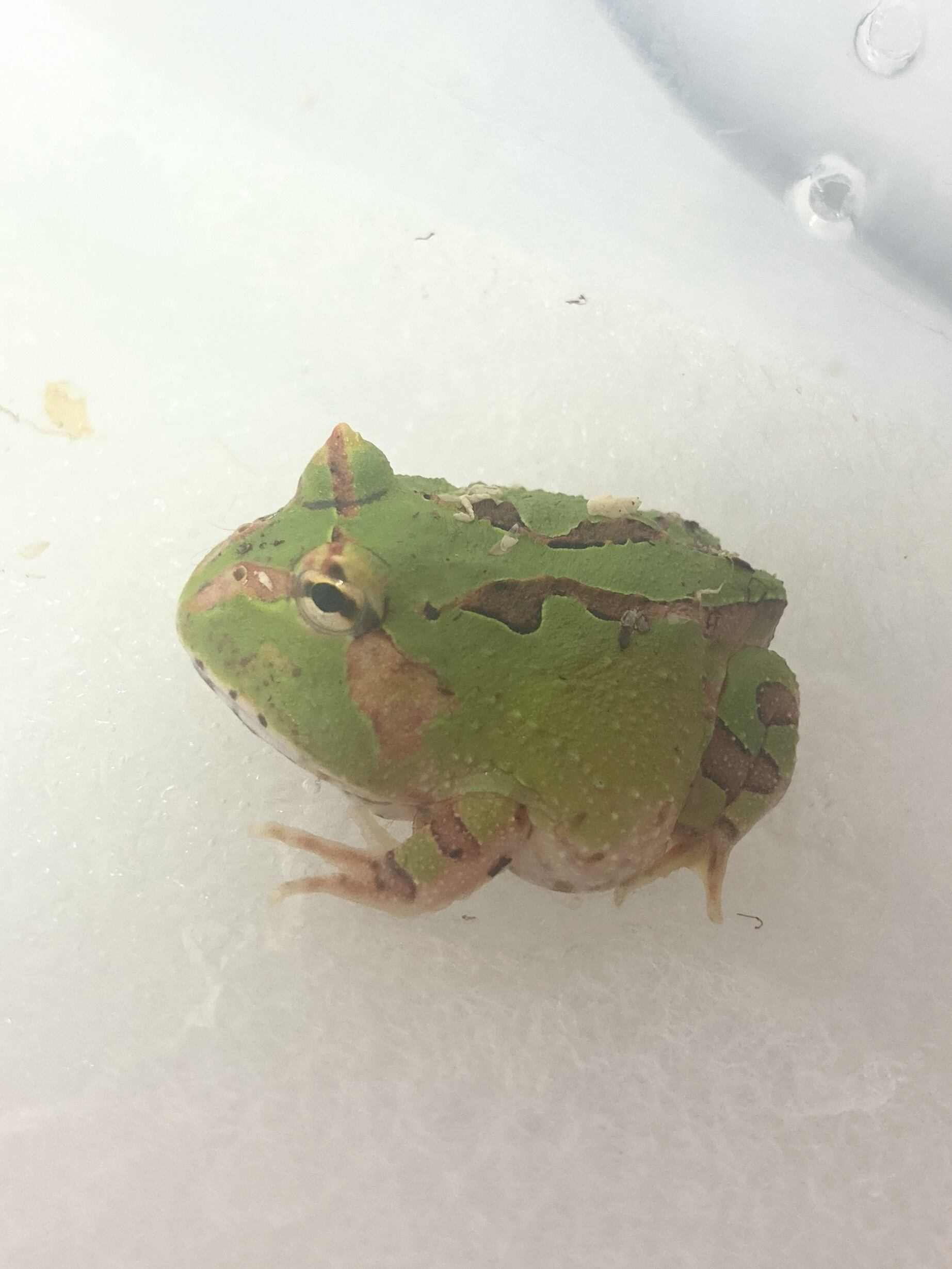 アマゾンツノガエルとクランウェルツノガエルのハイブリット個体です。
