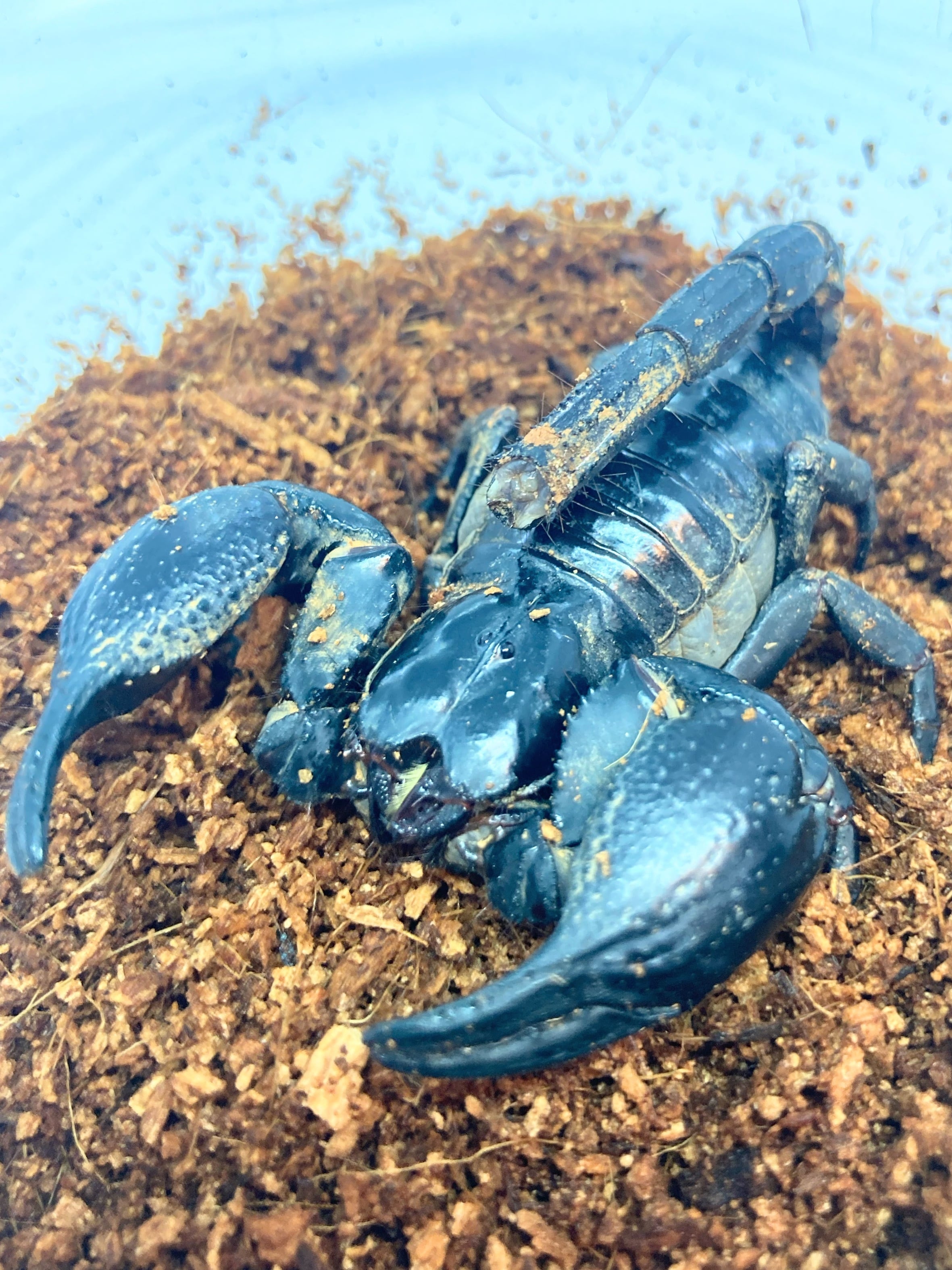 アジアンフォレストスコーピオンとして総称されるサソリの1種。大きさは最大で全長15cm前後になります。