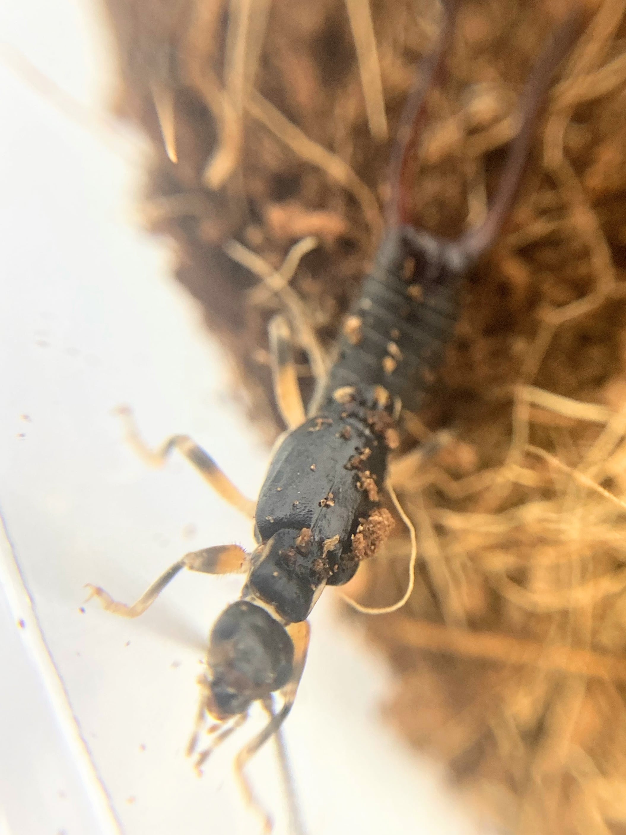 全身真っ黒なボディに水牛のツノのようなハサミを持つハサミムシ。