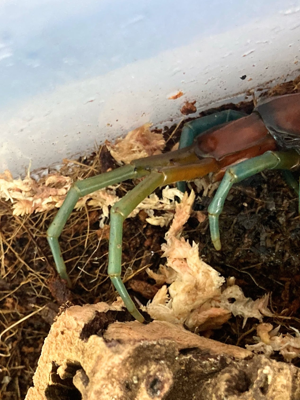 薄く赤みがかったボディに最大の特徴である淡いグリーンの脚が特徴の美ムカデ!