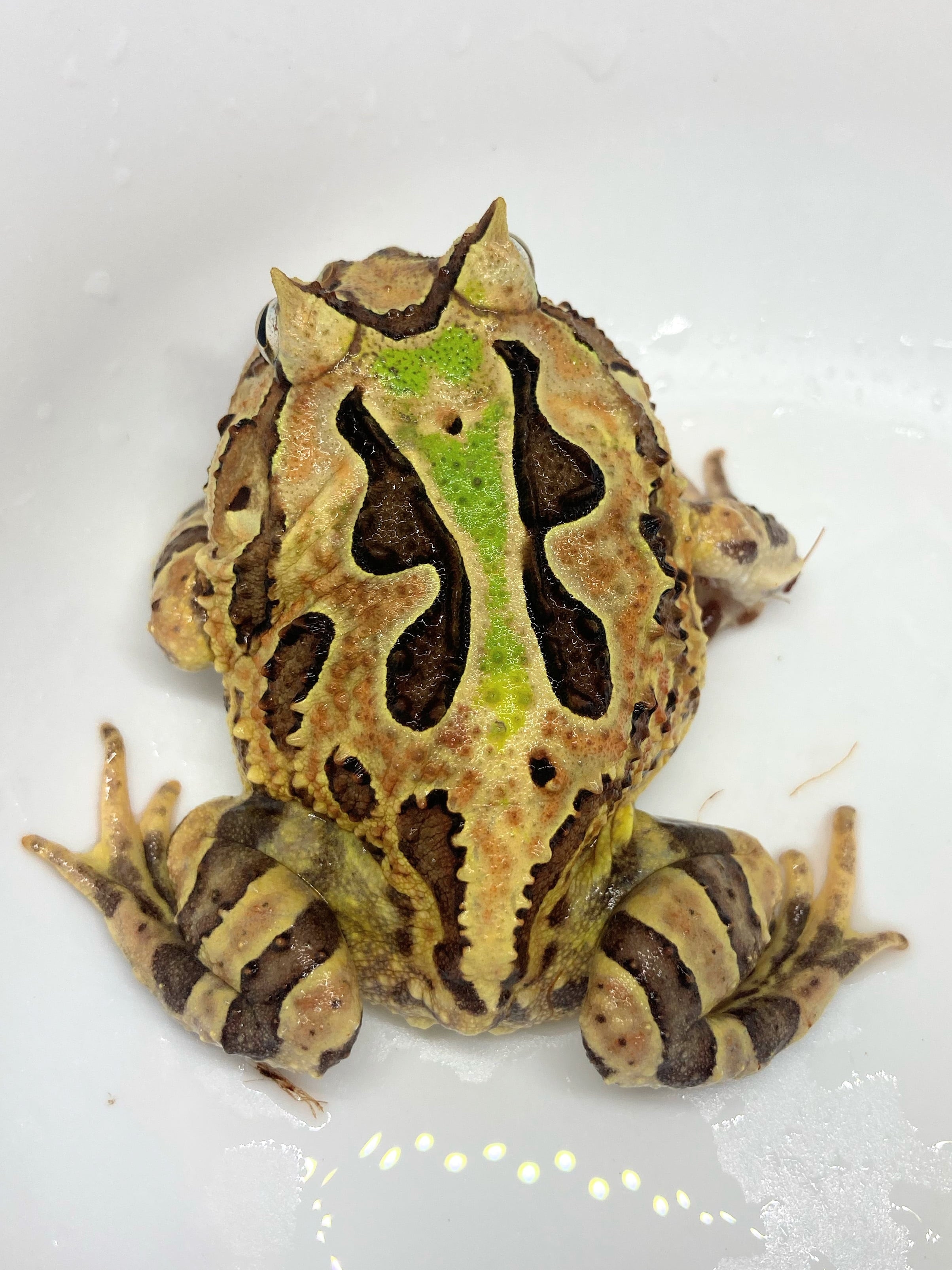 アマゾンツノガエルとクランウェルツノガエルのハイブリット個体です。