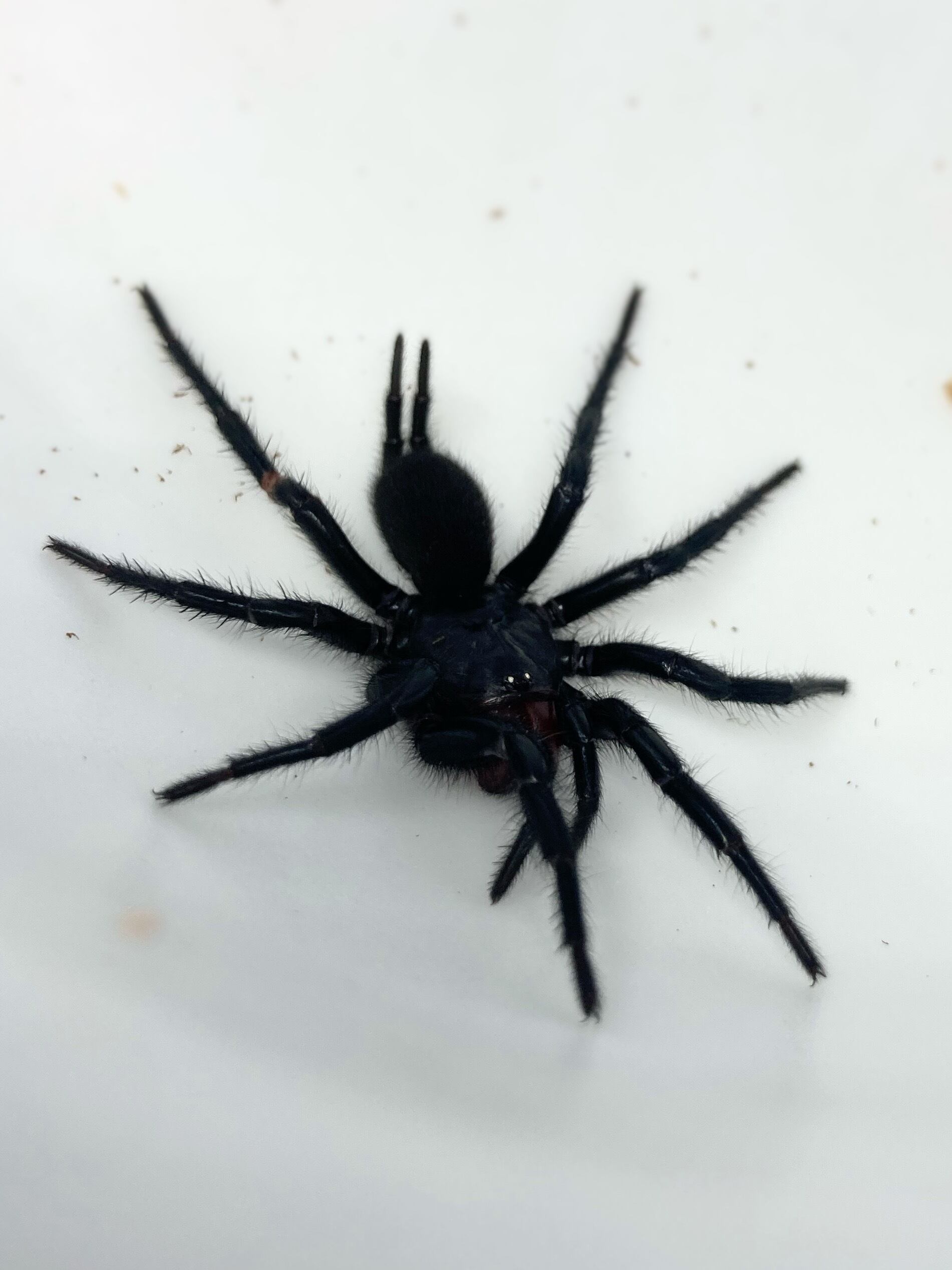 漆黒のボディに怪しく赤く染まる牙が恐ろしい雰囲気を醸し出す地中性のクモ。