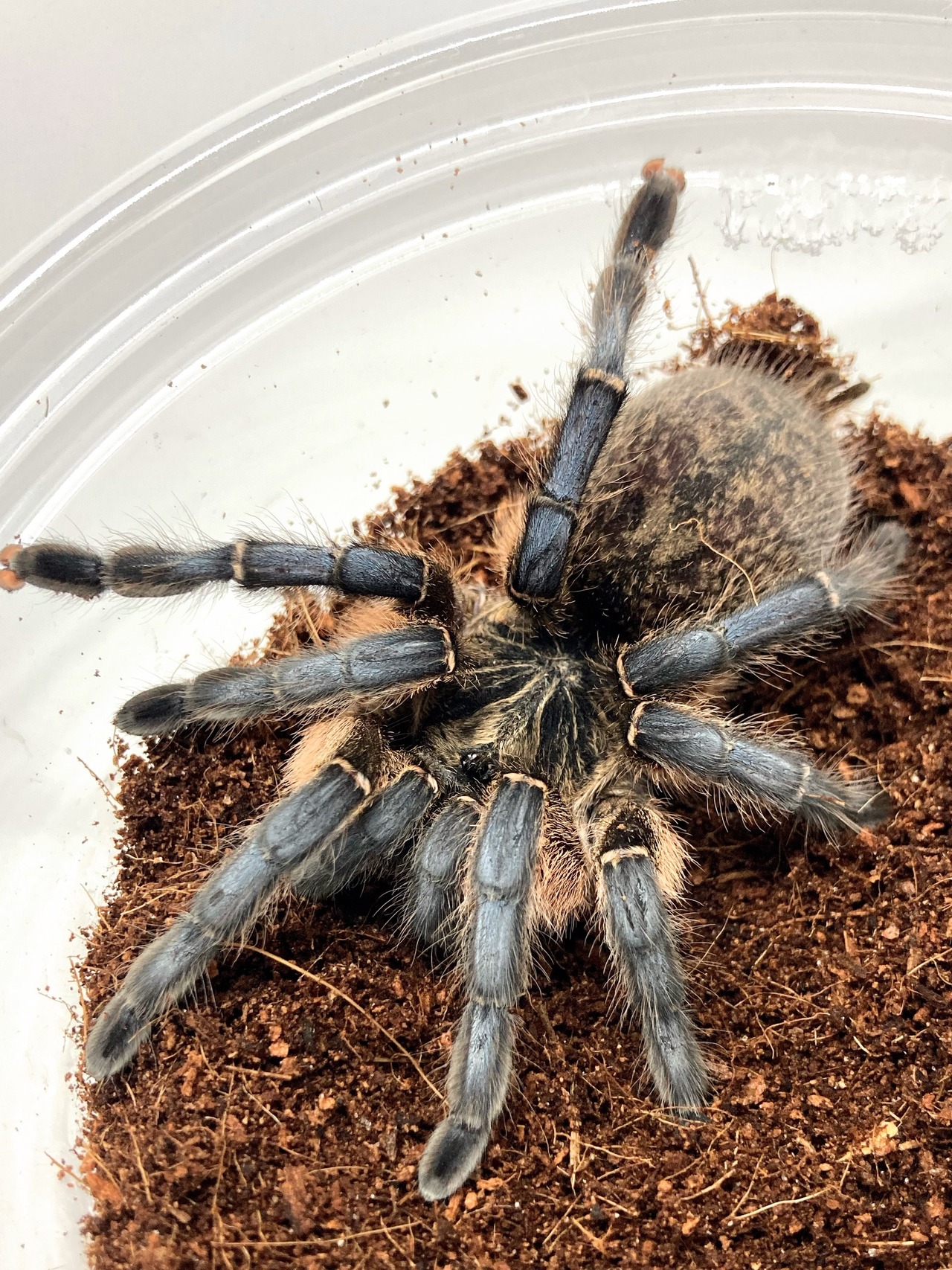 金色の体に脚だけ青く光り輝く美しいタランチュラ。