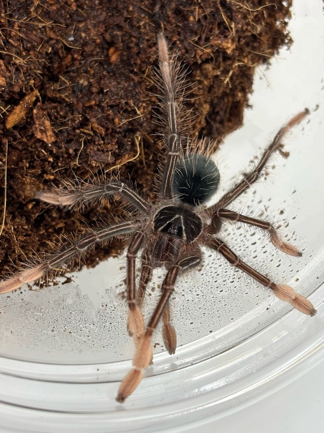 南アフリカに生息するタランチュラ。大きさは最大で体長約5cm。 体長約1cmの個体をランダムに発送させていただきます。 金色の体に脚だけ青く光り輝く美しいタランチュラ。 乾燥した環境を好みます。 穴を掘って地中で生活するので、床材は厚めに敷いてください。
